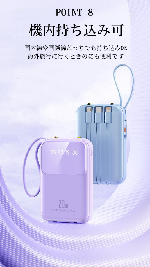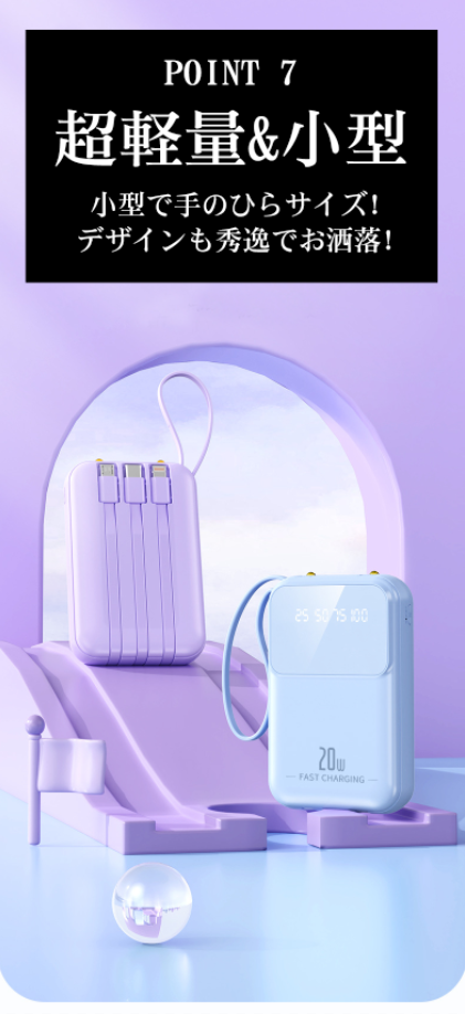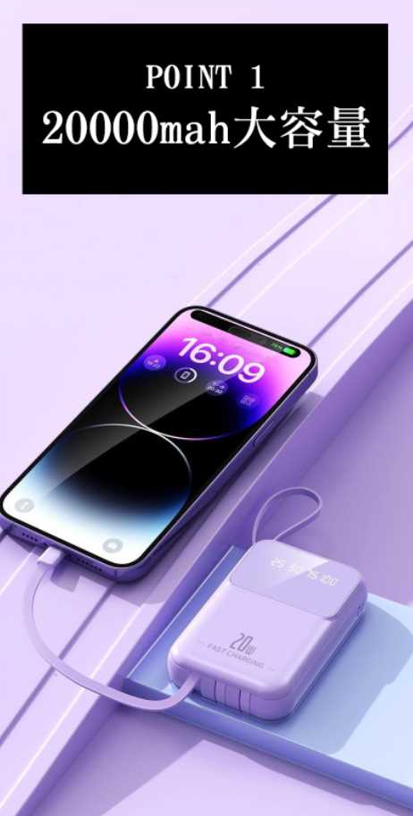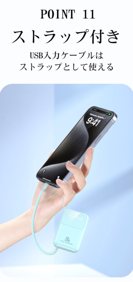【軽量・大容量携帯バッテリー】20000mAh大容量。約200gの超軽量タイプ、手軽にスマホを充電できる上に、内蔵ケーブルがストラップに変身され、片手で充電しながらスマホも使用可能で、持ち運びに超便利。ポケットにもすっぽり収まり、出張や旅行などの短期外出だけでなく、台風、地震など緊急災害時に非常用電源としても使えます。