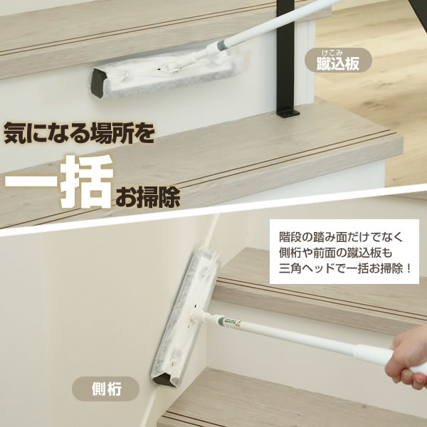 気になるところを一括お掃除三角ヘッドがスミまで届く!階段の踏み板だけでなく、側板や前面の蹴込板もラクラクお掃除できます。