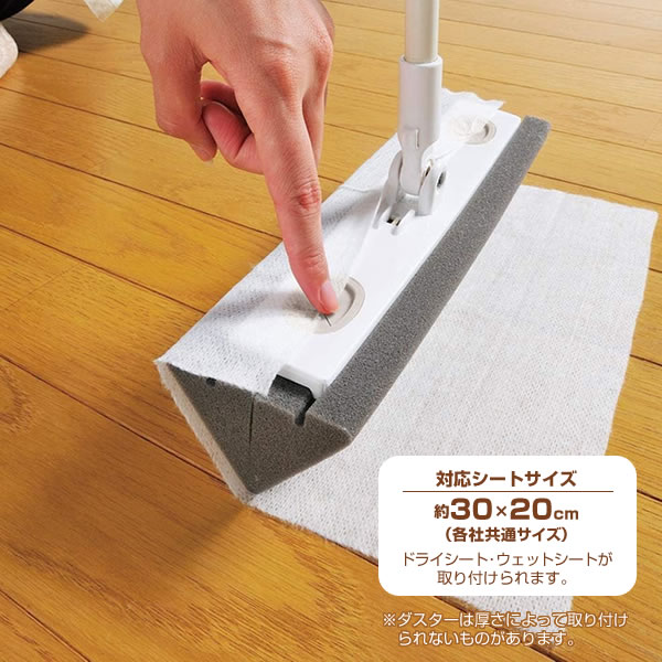 ドライシートもウェットシールもOK30×20cm(各社共通サイズ)のドライシートまたはウェットシートが取付けられます。※シート・ダスターは別売りです。※ダスターは厚さによって取り付けできないものがあります。