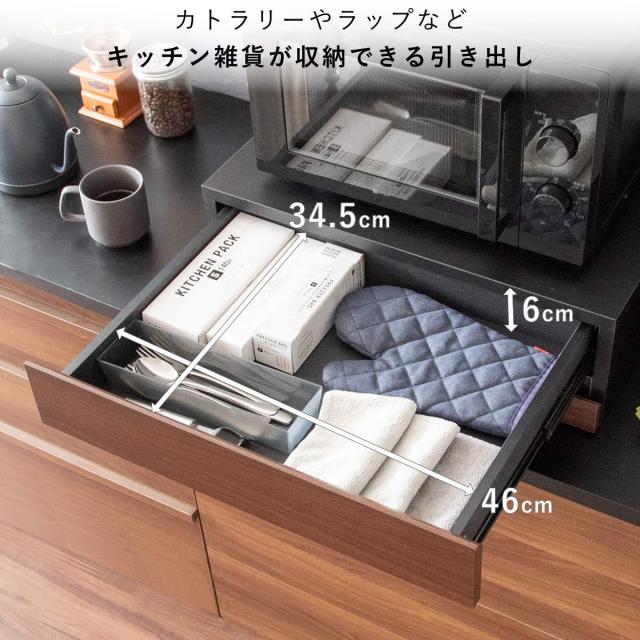 天板下の引き出しには、キッチンに置きたいカトラリーやラップ、ミトンなどをまとめて収納できるのでキッチン周りがすっきり片付きます。