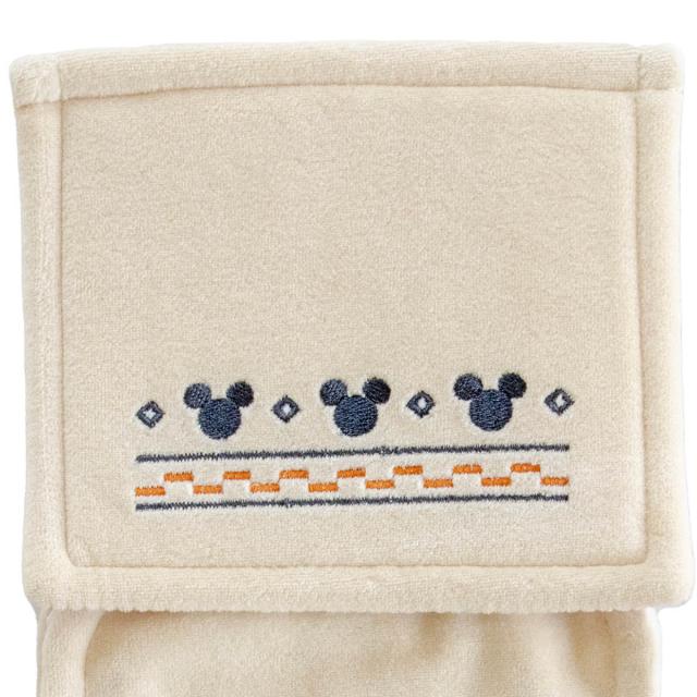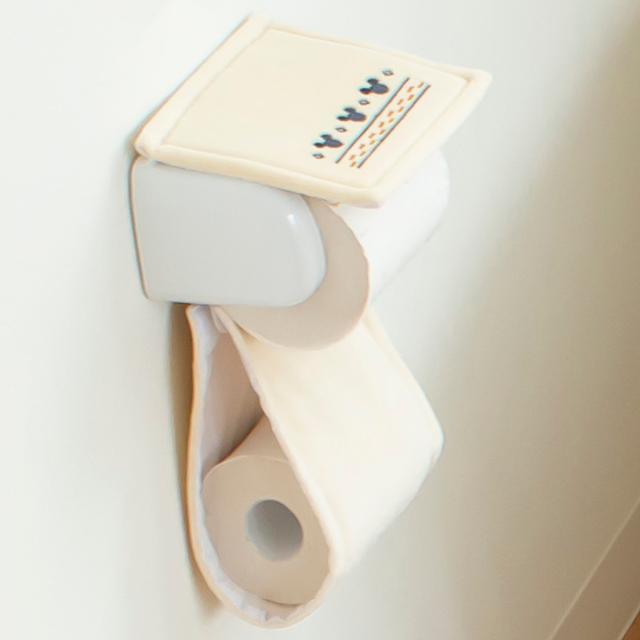 ミッキーのワンポイントがかわいいペーパーホルダーカバーです。落ち着いた温かみのある色味でインテリアに馴染みやすいデザインです。直径約12cmまでのトイレットペーパーに対応しています。