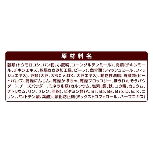 | 穀類(トウモロコシ、パン粉、小麦粉、コーングルテンミール)、肉類(チキンミール、チキンエキス、乾燥ささみ加工品、ビーフ)、魚介類(フィッシュミール、フィッシュエキス)、豆類(大豆、大豆たんぱく、大豆エキス)、動物性油脂、野菜類(ビートパルプ、乾燥にんじん、乾燥かぼちゃ、乾燥ブロッコリー、ほうれんそうパウダー)、チーズパウダー、ミネラル類(カルシウム、塩素、銅、鉄、ヨウ素、カリウム、ナトリウム、リン、セレン、亜鉛)、ビタミン類(A、B1、B2、B6、B12、D、E、K、コリン、パントテン酸、葉酸)、酸化防止剤(ミックストコフェロール、ハーブエキス) |