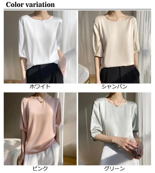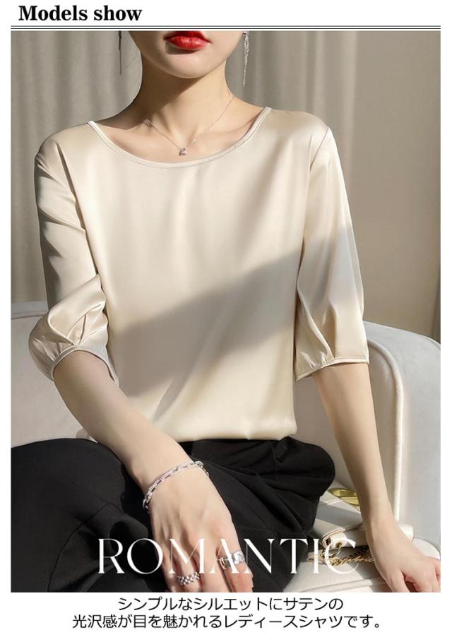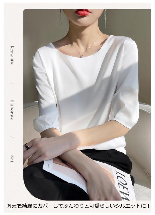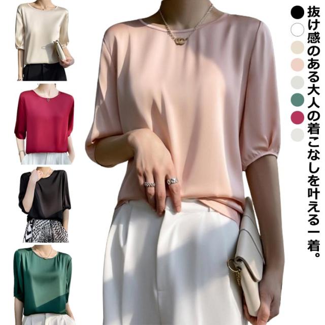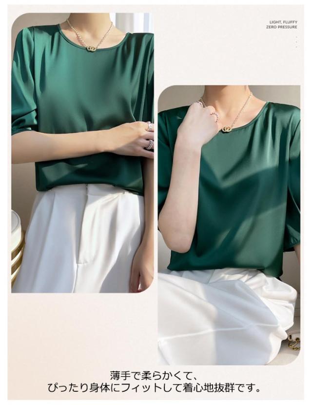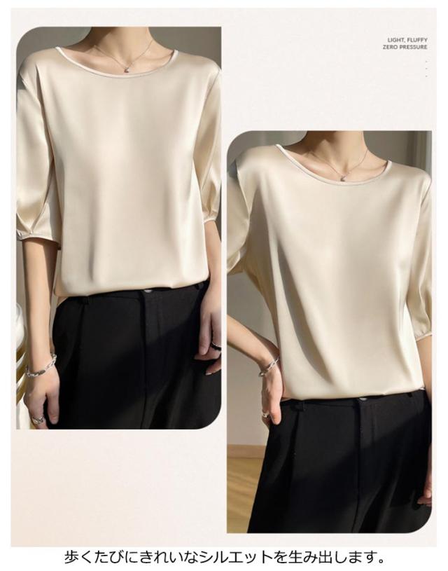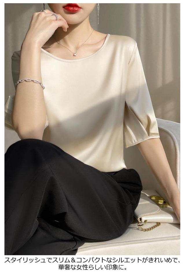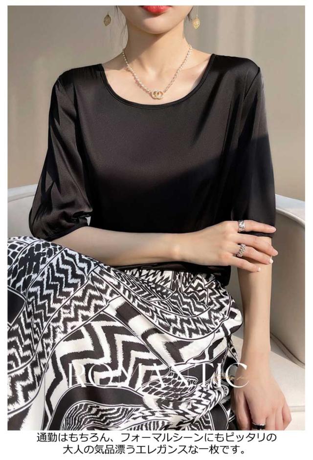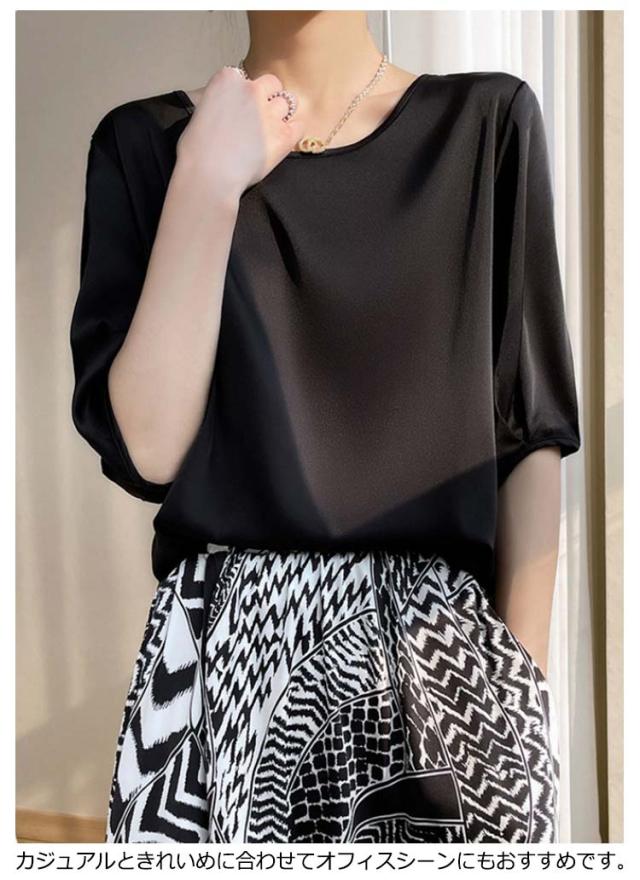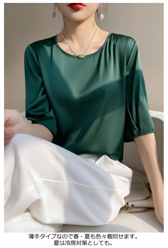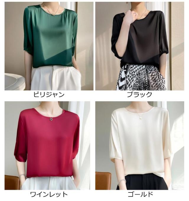シルク シャツ ブラウス 五分袖 レディース クールネック プルオーバー トップス 体型カバー フォーマル スーツ インナー ミドル丈 着痩せ 冷感 光沢感 大人 上品 フェミニン 清楚感 きれいめ 通勤 オフィス きれいめ 無地 春夏 シンプル おしゃれ
