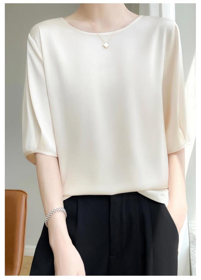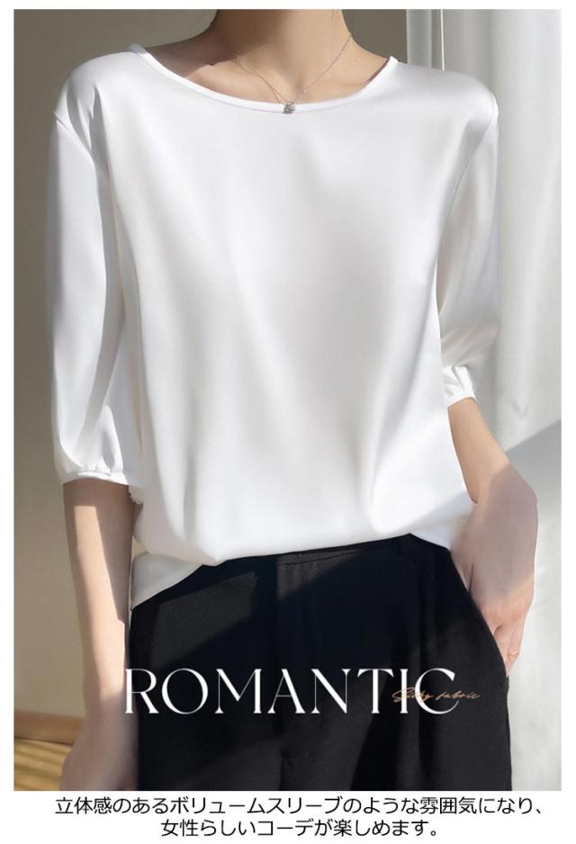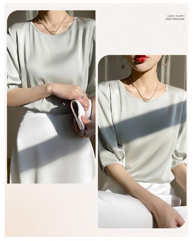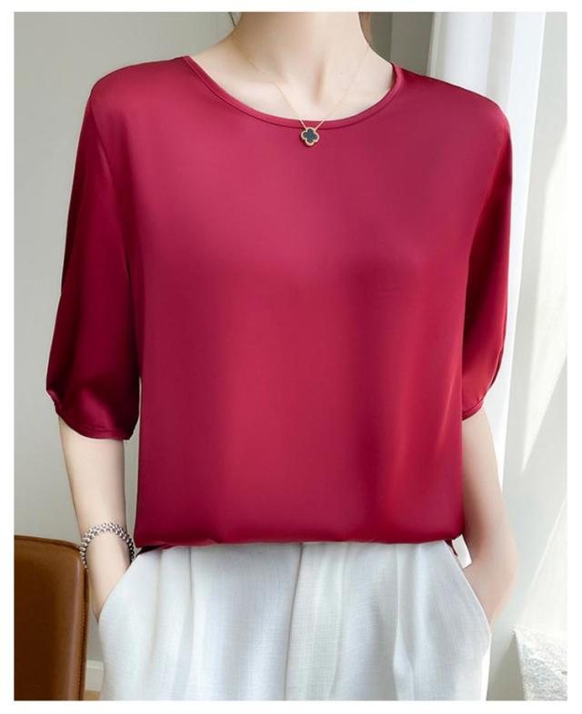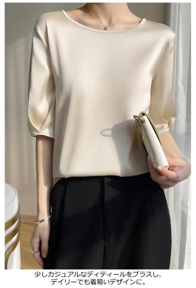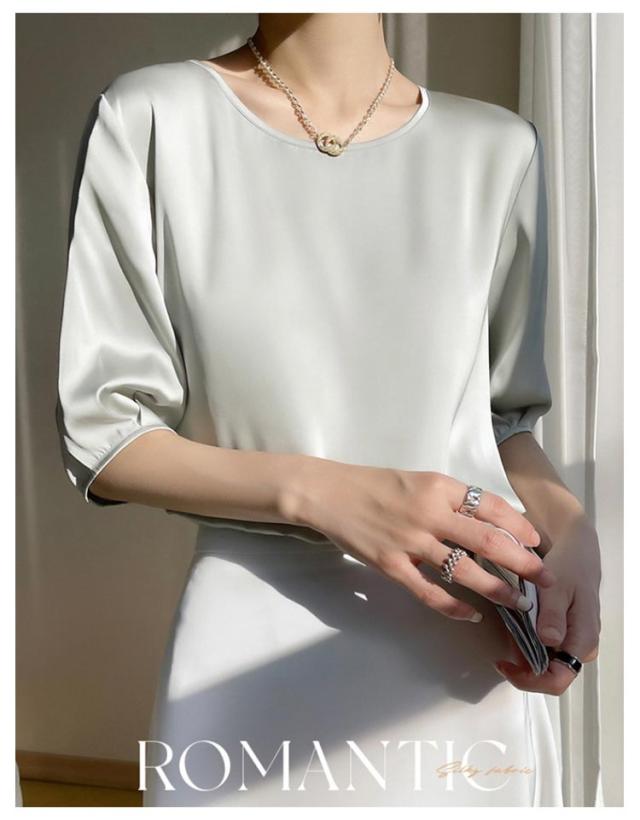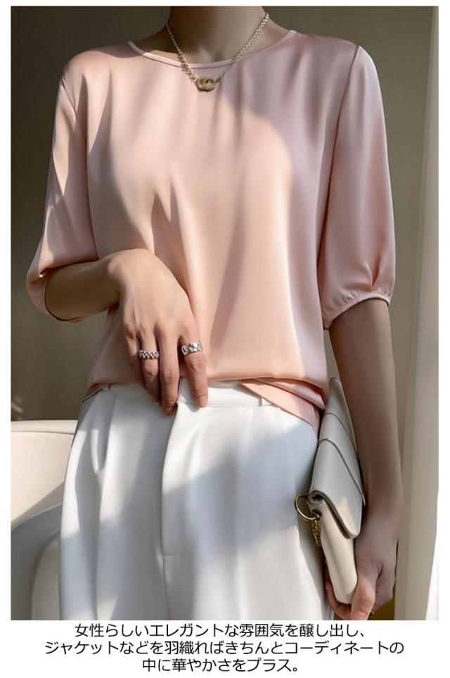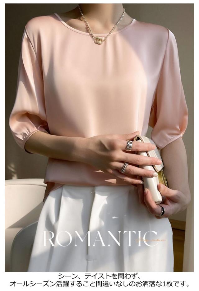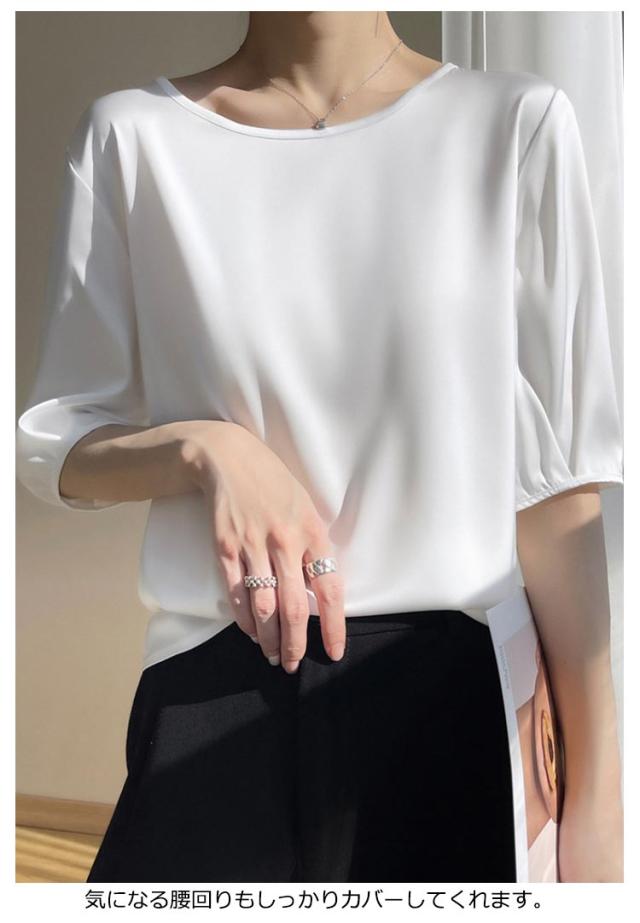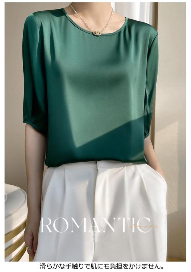 シルク シャツ ブラウス 五分袖 レディース クールネック プルオーバー トップス 体型カバー フォーマル スーツ インナー ミドル丈 着痩せ 冷感 光沢感 大人 上品 フェミニン 清楚感 きれいめ 通勤 オフィス きれいめ 無地 春夏 シンプル おしゃれ