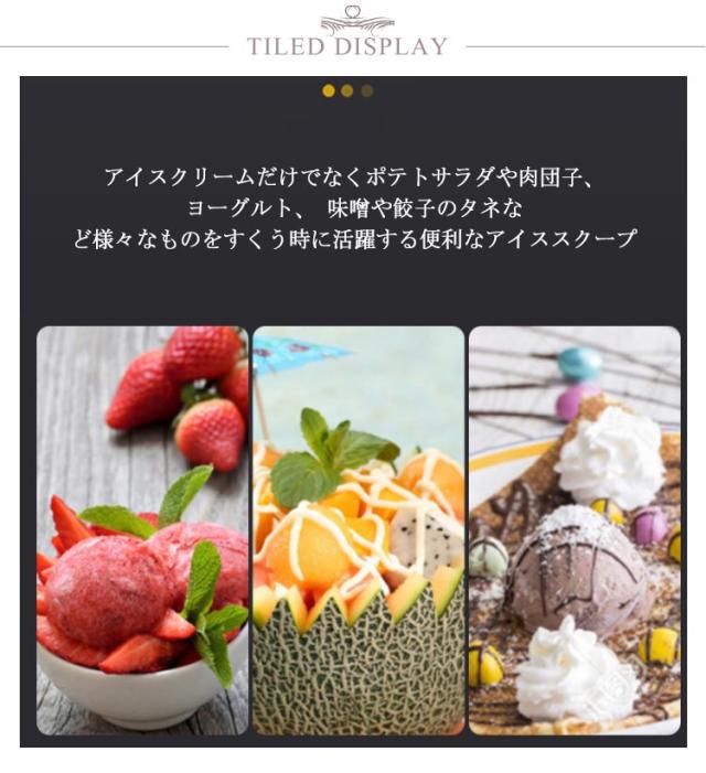 | サイズについての説明 | ※実寸はメジャー採寸の為、若干の誤差が生じる場合があります。 ※注意事項:サブゼロアイスクリームのような固いものでは使用しないでください。お玉の部分を直接熱湯の中に入れないで下さい。中の刃が変形して動きがにぶくなるおそれがあります。アイスデッシャーはデリケートに出来ております。高い所から落したりぶつけたりは厳禁です。故障の原因になります。 |