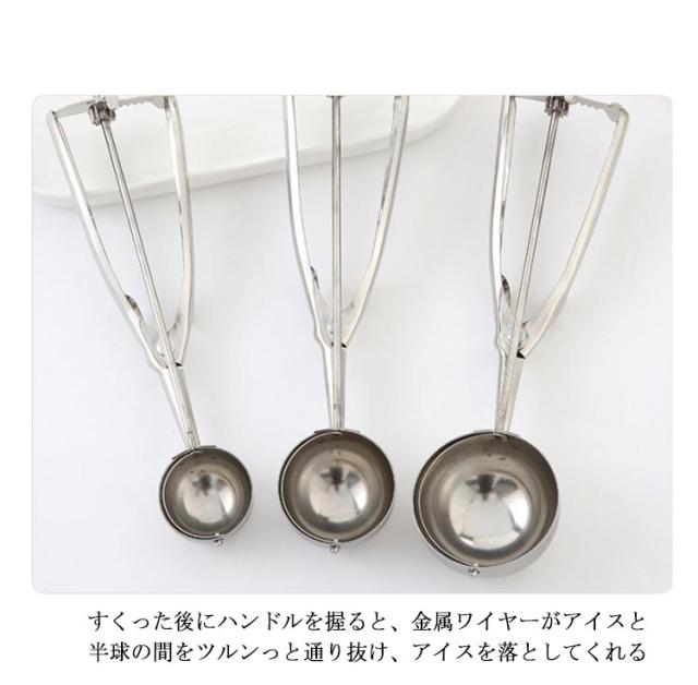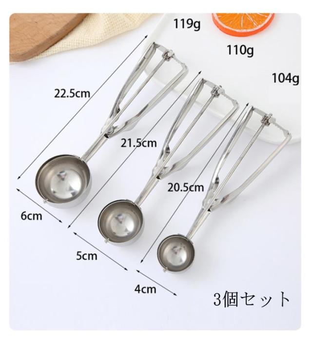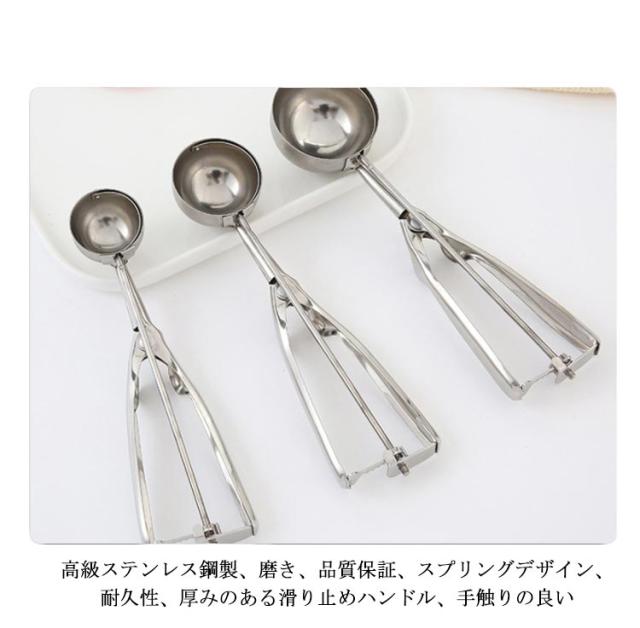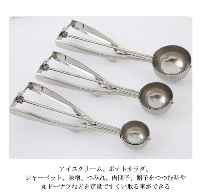 | 3個セット アイスクリームだけでなくポテトサラダや肉団子、ヨーグルト、 味噌や餃子のタネなど様々なものをすくう時に活躍する便利なアイススクープ 高級ステンレス鋼製、磨き、品質保証、スプリングデザイン、耐久性、厚みのある滑り止めハンドル、手触りの良い すくった後にハンドルを握ると、金属ワイヤーがアイスと半球の間をツルンっと通り抜け、アイスを落としてくれる アイスクリーム、ポテトサラダ、シャーベット、味噌、つみれ、肉団子、餡子をつつむ時や丸ドーナツなどを定量ですくい取る事ができる | |