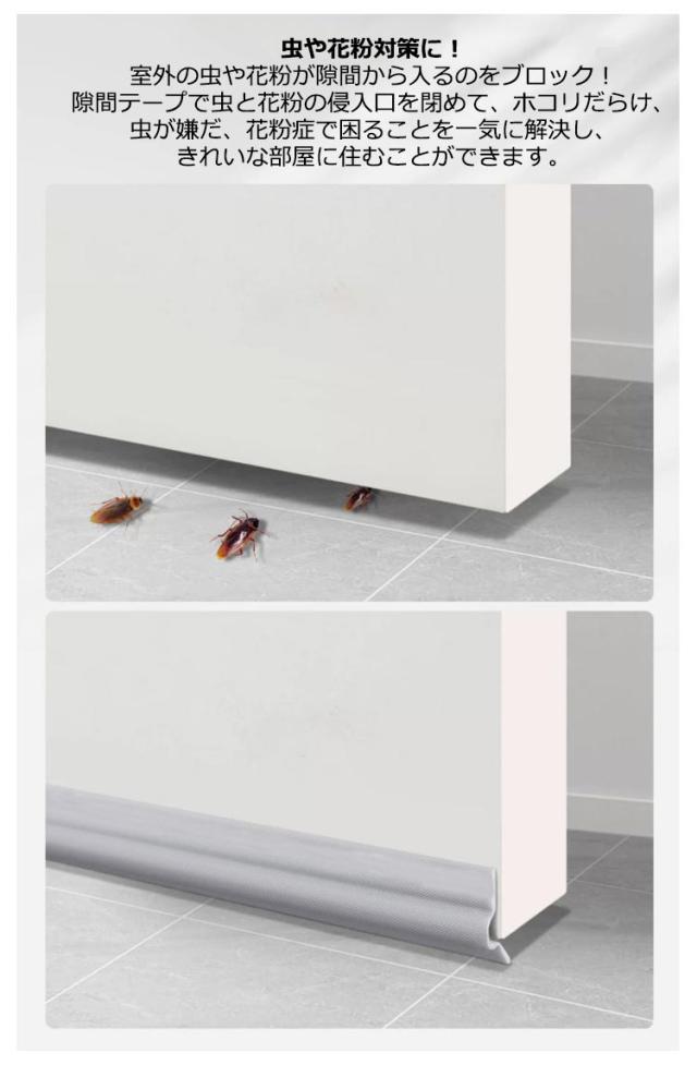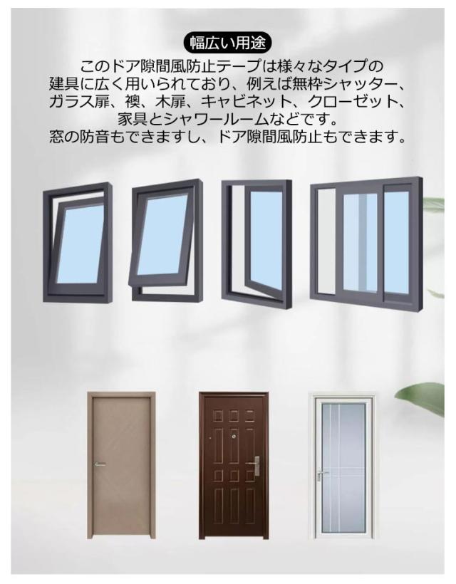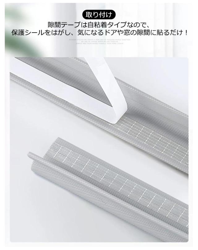 | 【取り付け】 隙間テープは自粘着タイプなので、保護シールをはがし、気になるドアや窓の隙間に貼るだけ! 【幅広い用途】 このドア隙間風防止テープは様々なタイプの建具に広く用いられており、例えば無枠シャッター、ガラス扉、襖、木扉、キャビネット、クローゼット、家具とシャワールームなどです。 窓の防音もできますし、ドア隙間風防止もできます。 虫や花粉対策に! 室外の虫や花粉が隙間から入るのをブロック! 隙間テープで虫と花粉の侵入口を閉めて、ホコリだらけ、虫が嫌だ、花粉症で困ることを一気に解決し、きれいな部屋に住むことができます。 | |
