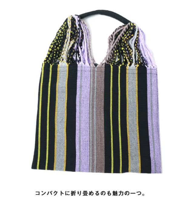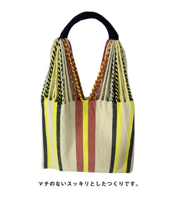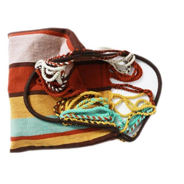 | ・ハンモックのサスペンション部分が持ち手のデザインになったトートバッグ ・多色使いで、コーディネートに程よいアクセントを加えます。 ・A4サイズが入る使いやすいサイズ感です。 ・マチのないスッキリとしたつくりです。 ・コンパクトに折り畳めるのも魅力の一つ。 ・小さくまとまり、かさばらないのでサブバッグとしてお出かけ時にも気軽に持ち運びが可能です。 | |
