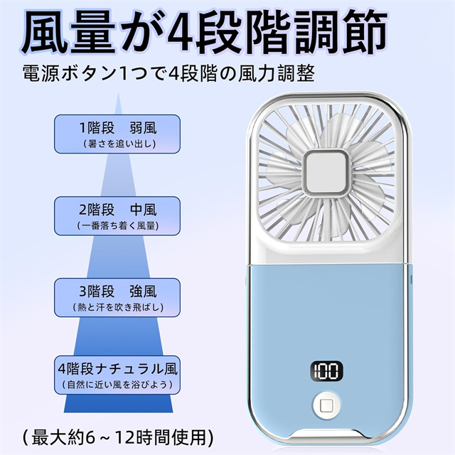 - スマホなみのコンパクトで 5way 購入して とても良かったです 液晶部分も可愛らしく残量表示はほんとありがたいです ブルーを購入しました 今年のGWは暑そうなので早速活躍しそうです