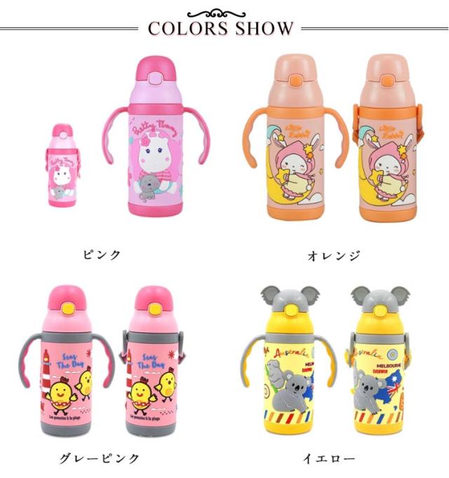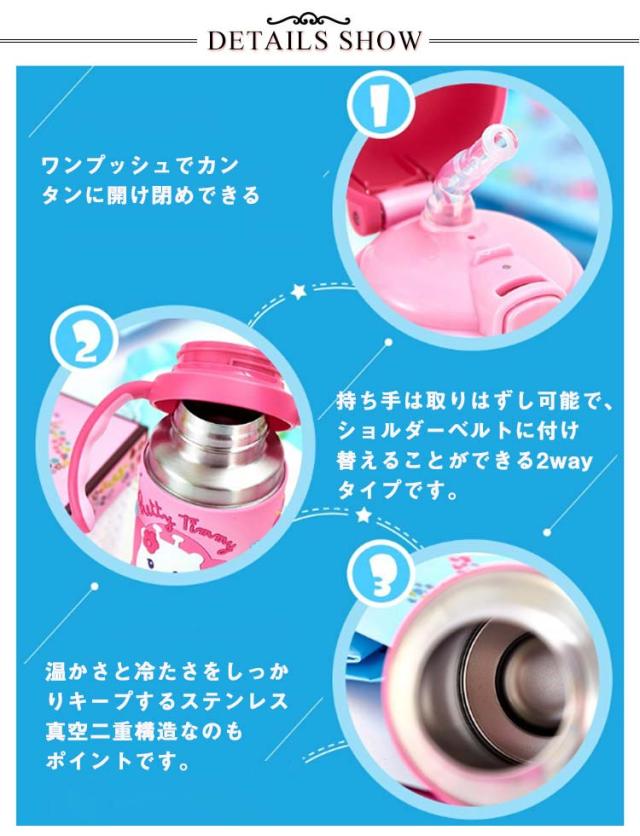 | ・ショルダーベルトが付けられる両手持ち手付きストローボトル ・飲みやすいストロータイプ ・お子さまが持ちやすい両手ハンドル式で、持って飲む練習にぴったり! ・持ち手は取りはずし可能で、ショルダーベルトに付け替えることができる2wayタイプです。 ・ワンプッシュでカンタンに開け閉めできる ・温かさと冷たさをしっかりキープするステンレス真空二重構造なのもポイントです。 ・底にはシリコン製の滑り止めカバーつきで倒れにくい。 | |