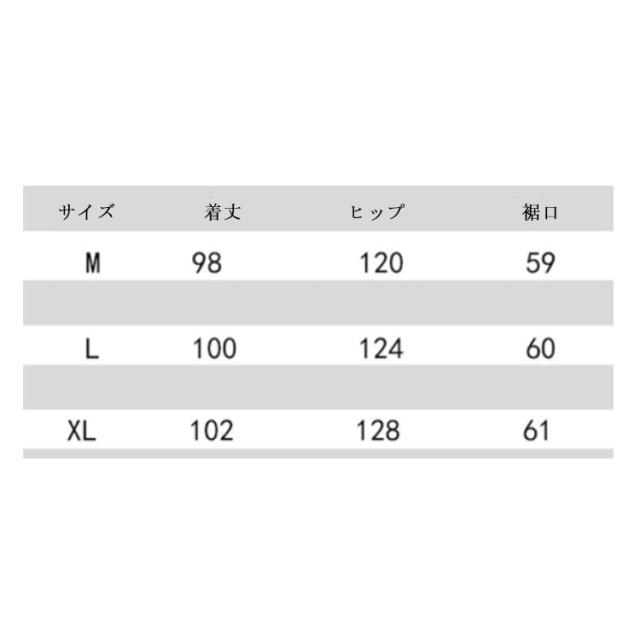 | サイズについての説明 | S:パンツ丈96cm/ ウエストゴム ヒップ116cm/ M:パンツ丈98cm/ ウエストゴム ヒップ120cm/ L:パンツ丈100cm/ ウエストゴム ヒップ124cm/ XL:パンツ丈102cm/ ウエストゴム ヒップ128cm/ 2XL:パンツ丈104cm/ ウエストゴム ヒップ132cm/ 3XL:パンツ丈106cm/ ウエストゴム ヒップ136cm/ ※上記サイズは平置き実寸になります。 サイズ表の実寸法は商品によって1-3cm程度の誤差がある場合がございます。 |