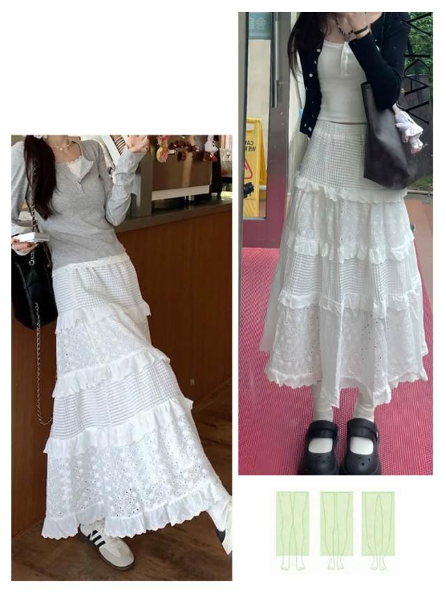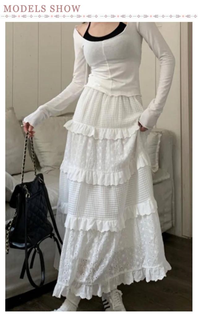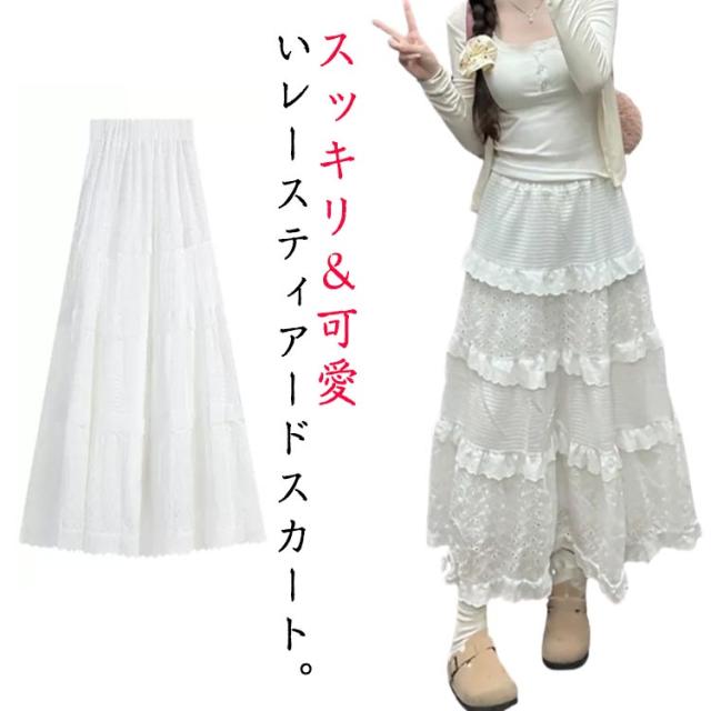 パンチングレース マキシスカート フリルスカート aライン マキシ丈スカート ロングスカート 森ガール レトロ スカート ウェストゴム ホワイト ドッキングスカート 着痩せ 夏 春 パンチングレース 裏地付き