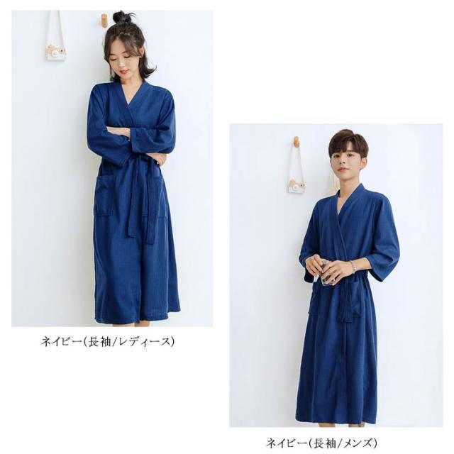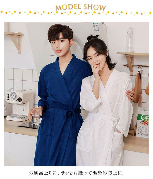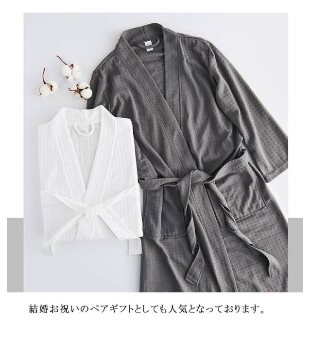 | やわらかな肌触りのワッフル地を使用したバスローブ。 【選べる長袖・半袖】 お風呂上りに、サッと羽織って湯冷め防止に。 また、ゆったり過ごしたいリラックスタイムのガウンとしても。 ワッフル素材なので、肌に触れる面積が少なく、さらっとした着心地です。 暑い時期は特に嬉しい速乾性! 両サイドにポケット付き。 結婚お祝いのペアギフトとしても人気となっております。 | |