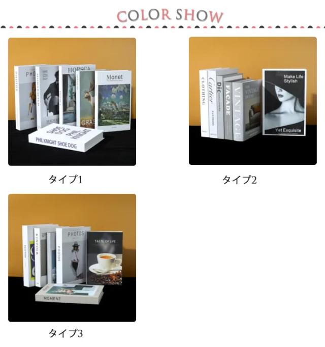 | ご家庭でも、お店の装飾としても使えるイミテーションブックです。 6冊セットなので場所に合わせてデザインを選ぶことができます。 リビング・玄関・寝室など、飾るだけでアクセントをプラスし、モダンな空間を作ることができます。 ご自宅だけでなく、カフェやオフィス、美容室などの内装ディスプレイにもお勧めです。 インテリアとしての使用だけでなく撮影小物としてもお使い頂けます。 | |