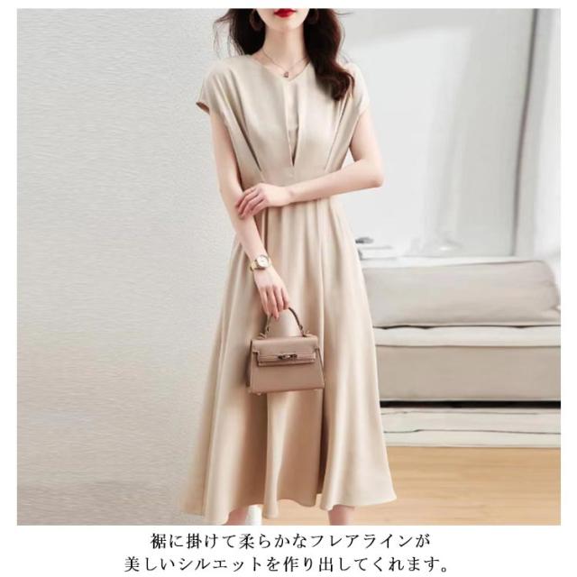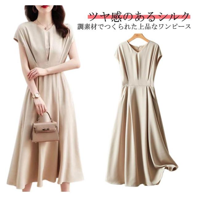 ワンピース レディース セレモニー ロングワンピース 半袖 フレンチスリーブ Vネック ドレス フレアワンピース ミモレ丈 キレイめ 上品 シルク調 オフィス OL 通勤 卒業式 入学式 ワンピ 発表会 春夏 20代 30代 40代 送料無料 ベージュ