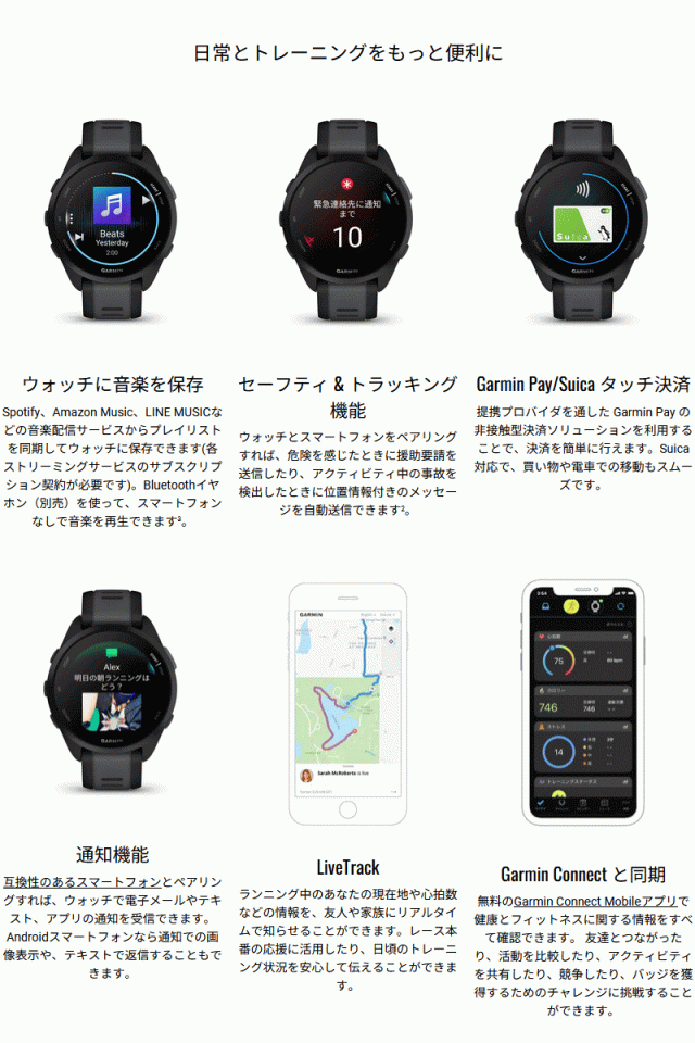 ■付属品:Forerunner 165 Music、標準付属ベルト Quick Release バンド 20mm、USB-C チャージングケーブル(Type B)、クイックスタートマニュアル