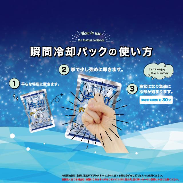 冷却開始後は、急激に温度が下がりますので、身体に当てる際は必ず布などで包んでご使用ください。(凍傷になるおそれがありますので、特に乳幼児、肌の弱い方へのご使用は十分ご注意ください。)