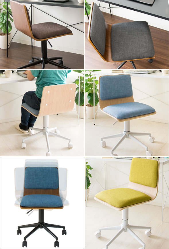 背もたれと座面が一体型になったしなやかな曲げ木フレームと肌触りのいいファブリック素材の張地が特徴のデスクチェア。