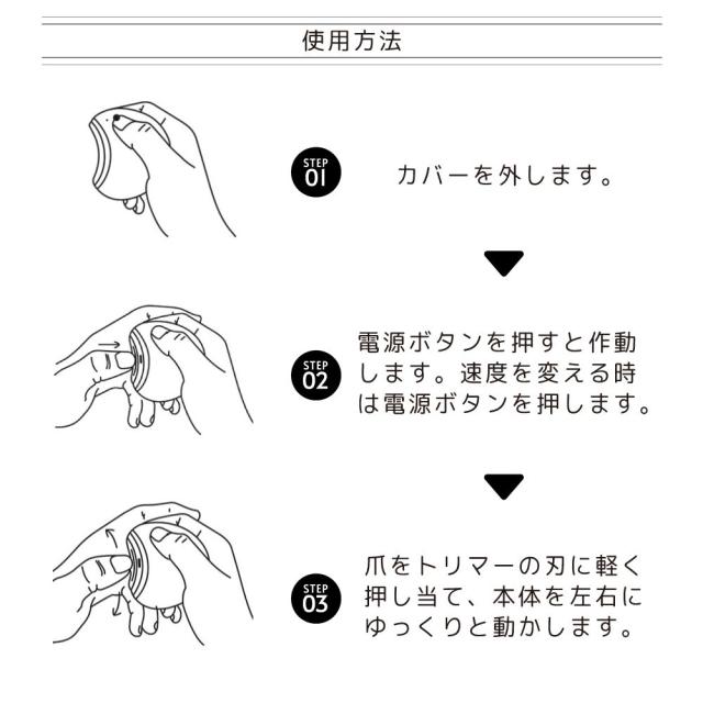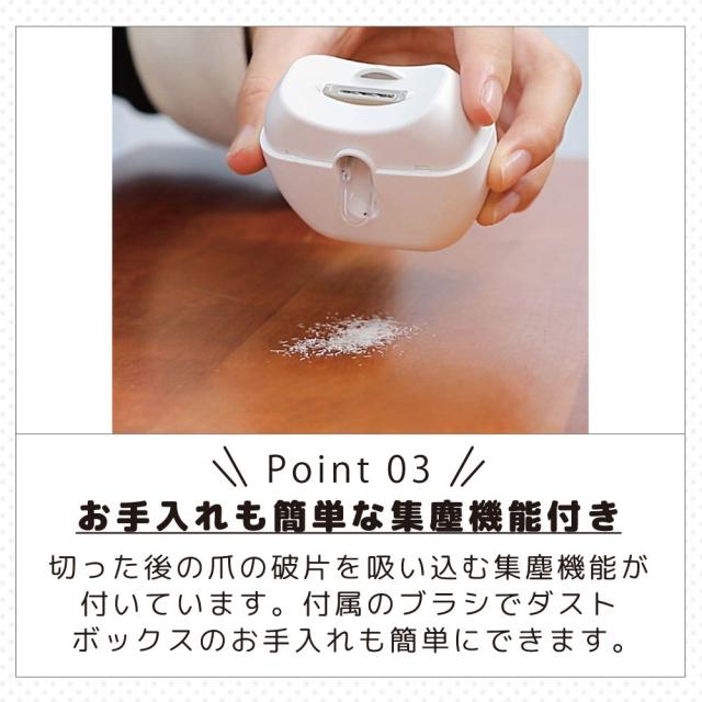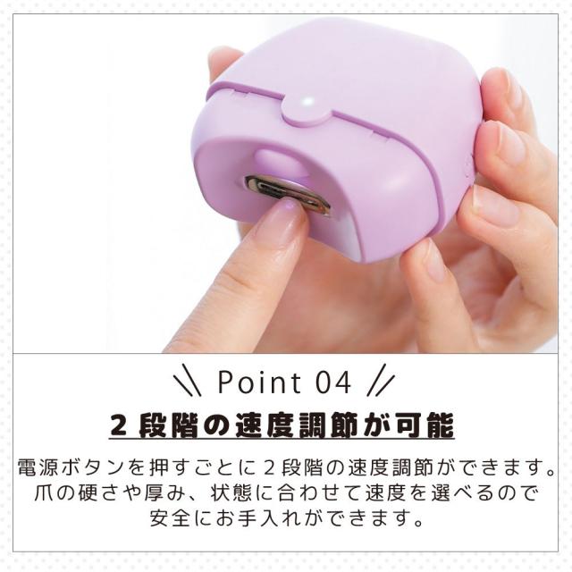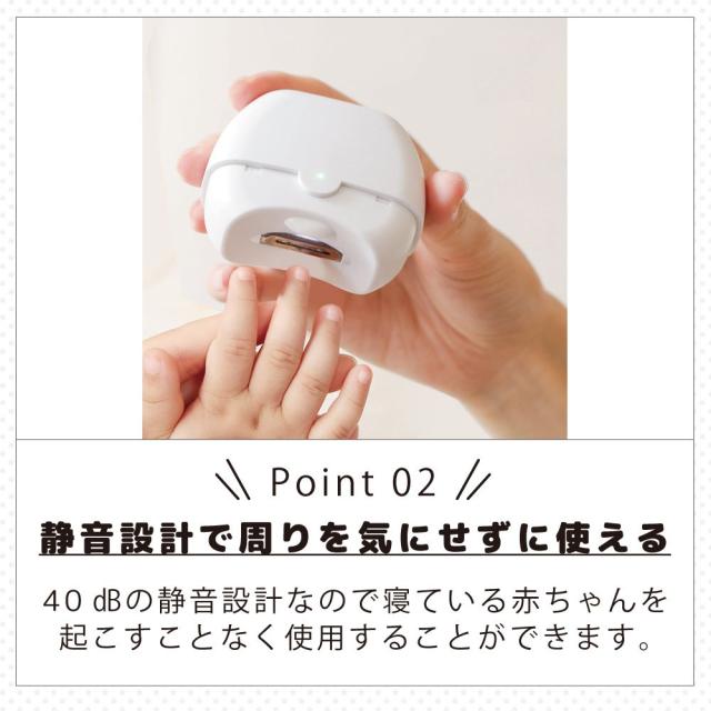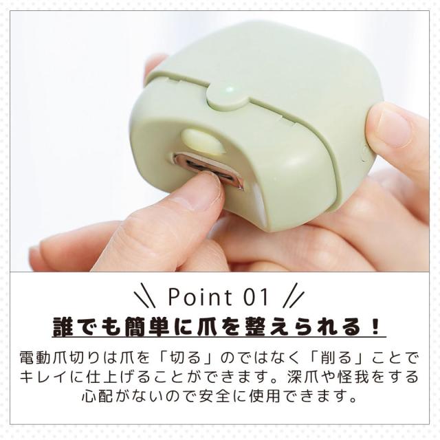爪を切るのではなく、削ることでキレイに仕上げることができるLEDライト付きのUSB充電式コンパクト電動爪切りです。 point1 誰でも簡単に爪を整えられる! point2 40dbの静音設計で周りを気にせず使える! point3 お手入れも簡単な集塵機能、専用のブラシ付き! point4 爪の状態に合わせた2段階の速度調整! point5 USB充電式で自宅はもちろん、外出先での使用できます! |