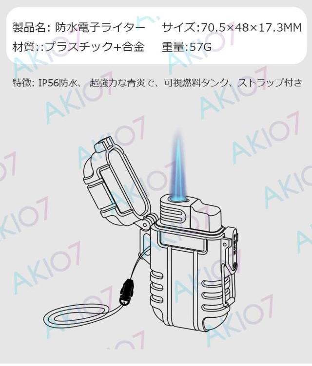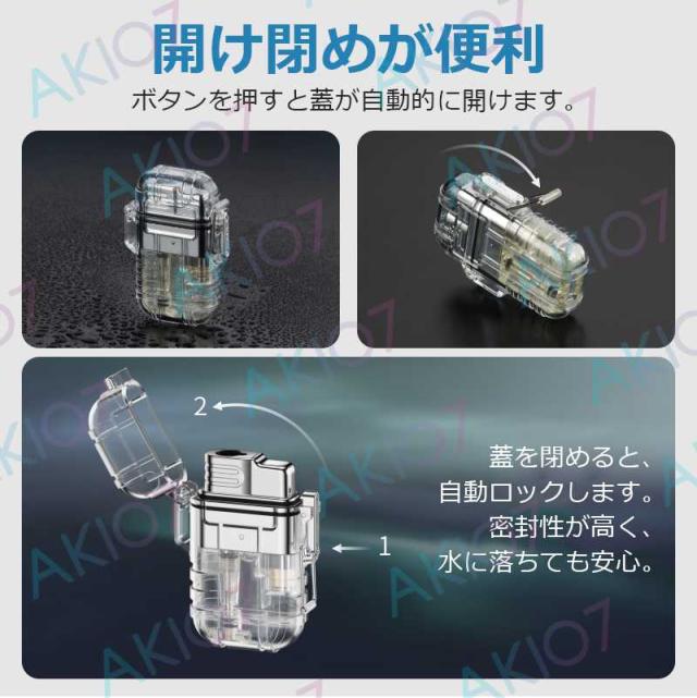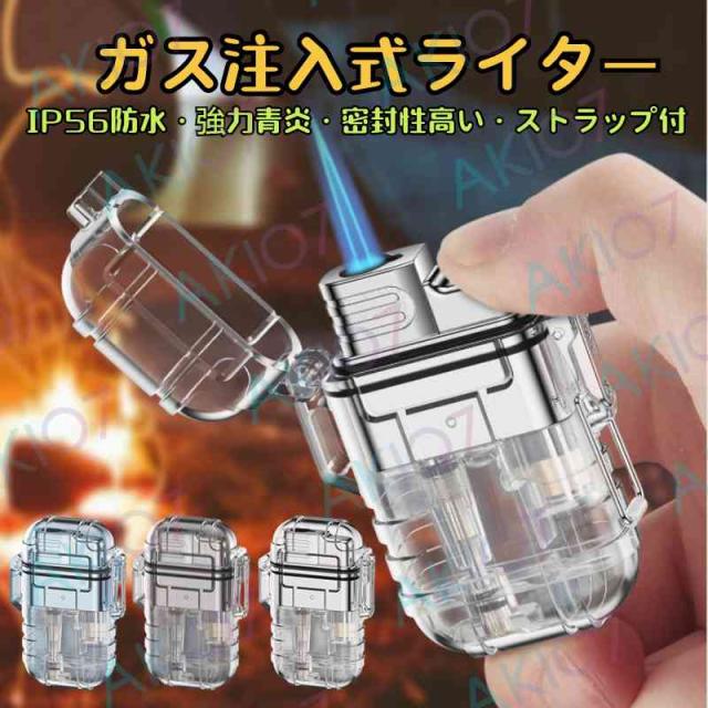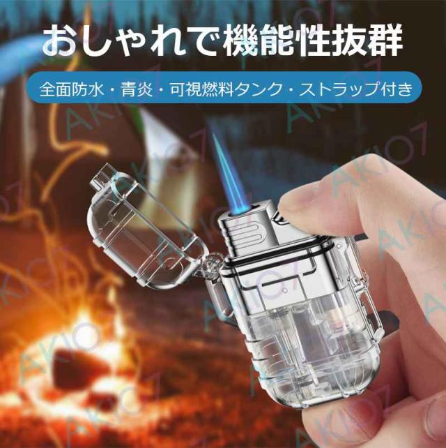 【火力調節可&ストラップ付】ガス注入式ライター ガスライター 強力 青炎 IP56防水 防風 防災グッズ 点火 透明 コンパクト 自動ロック 蓋 アウトドア 軽量