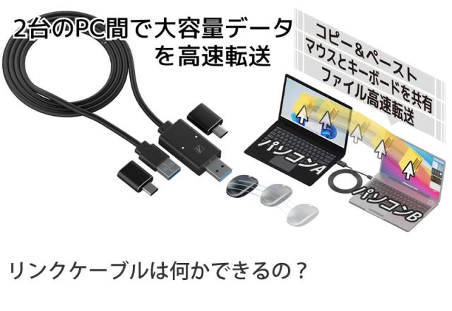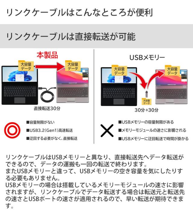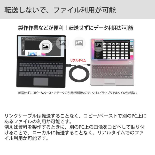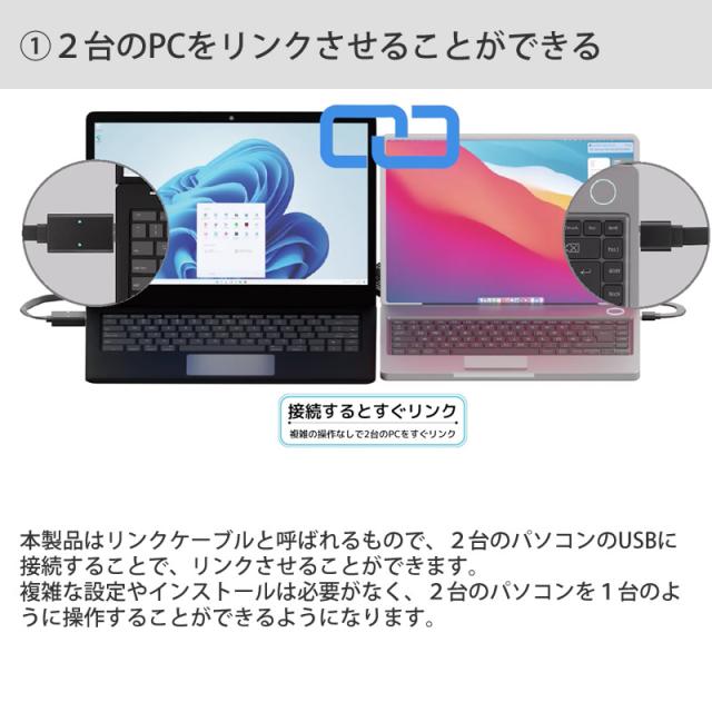 本製品はネットワークや複雑な設定、ソフトのインストールなしで2台のパソコンをリンクさせるUSBケーブル。