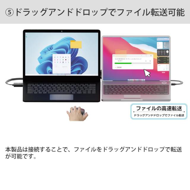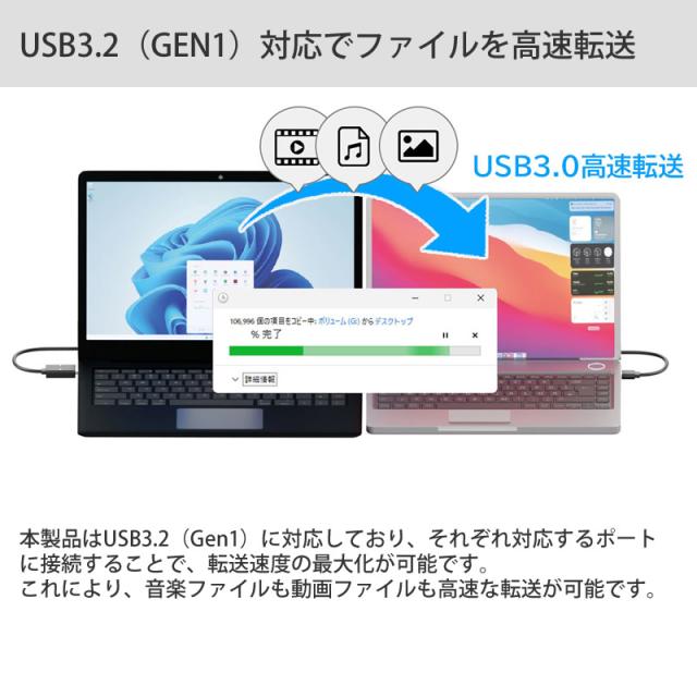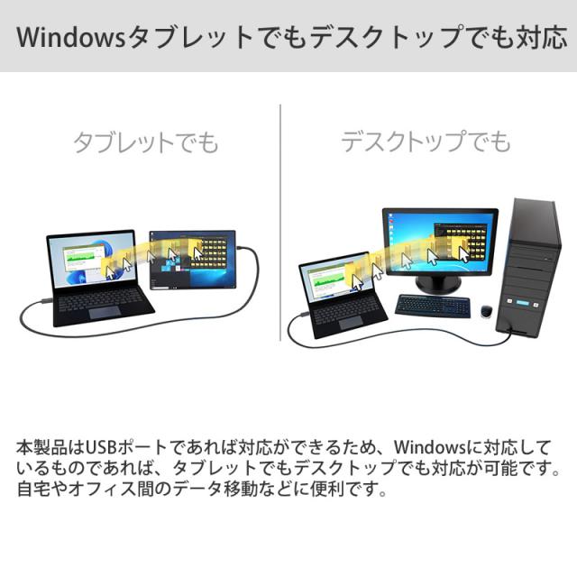 パソコン間のファイル転送もドラッグ&ドロップで行い、USB3.2(Gen1)高速転送を実現。