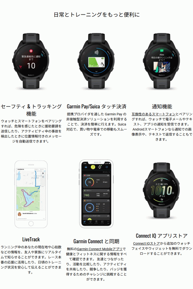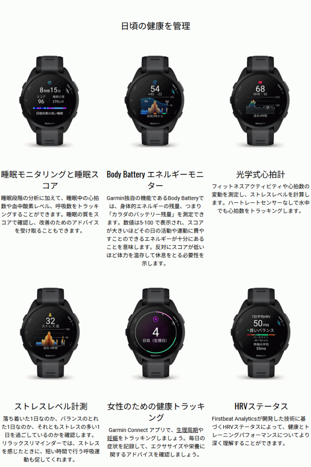 ■付属品:Forerunner 165、標準付属ベルト Quick Release バンド 20mm、USB-C チャージングケーブル(Type B)、クイックスタートマニュアル