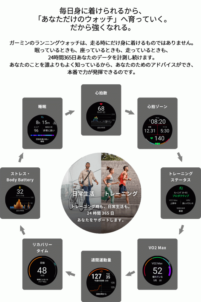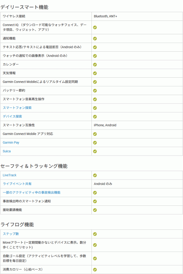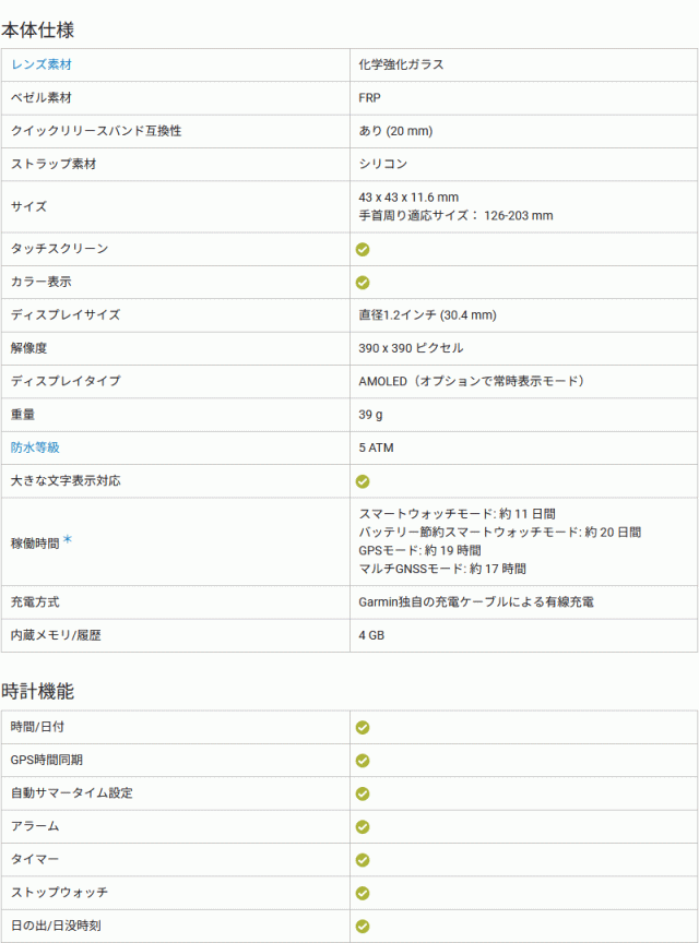■稼働時間:スマートウォッチモード約11日間、バッテリー節約スマートウォッチモード約20日間 、GPSモード約19時間、マルチGNSSモード約17時間