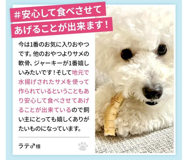 | ご注意 | ※本製品は間食用です。給与量目安を参照に与えてください。 ※必ず飼い主様の目の届く範囲で与えてください。 ※直射日光、高温多湿を避け、常温にて保存してください。 ※開封後は早めに与えてください。 ※天然素材の特性上、色、形状、香りにばらつきがありますが、品質には問題ありません。 |