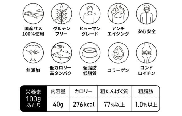 | 成分値 | 粗たんぱく質77%以上、粗脂肪1.0%以上、粗灰分6.0%以下、粗繊維0.5%以下、水分16%以下、エネルギー276kcal(ME)【100gあたり】 |