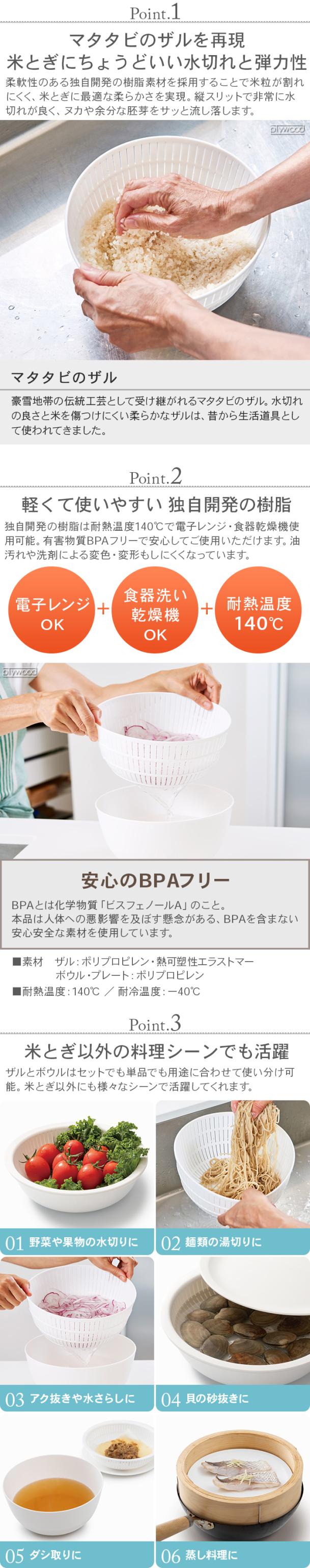 | 電子レンジ対応、食洗機対応 美味しいお米のとぎ方や、ザルとボウルを使ったレシピをまとめたリーフレット付き。 安心のBPAフリー |