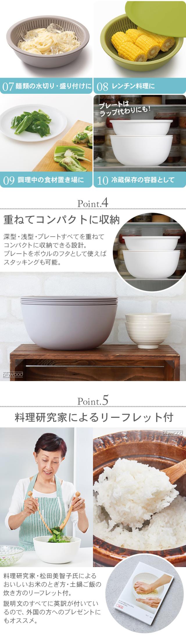 日本で古くから使われている「マタタビのザル」の弾力性と水切れを樹脂製品で再現した使いやすい定番の調理道具シリーズ。米とぎはモチロン、様々な調理シーンで活躍します。耐熱温度が140℃のため、電子レンジにも対応。温野菜作りや温め調理、麺類の湯切りにも活躍。陶器の食器やステンレスのボウルより全体が熱くなりにくいことも特徴です。ザルとボウルはすべてきれいに重ねられるデザインになっているため、収納時も場所を取りません。プレートもぴったり重なるため、ラップ代わりにもなります。冷蔵庫内で重ねて収納できるので効率よく食品を保管することができます。
