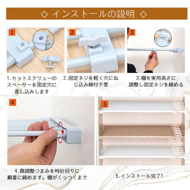工具不要で付属のT字型ネジで設置可能!壁を傷つけないので賃貸でも安心して収納をプラスできます。滑り止め付きで強度UP