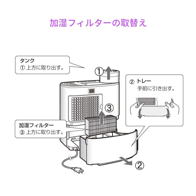フィルターにミネラル分が付着すると、雑菌やカビが繁殖し悪臭が発生したり、加湿量の低下や送風音が大きくなる原因になります。クエン酸で定期的なお手入れをお願いします。 |