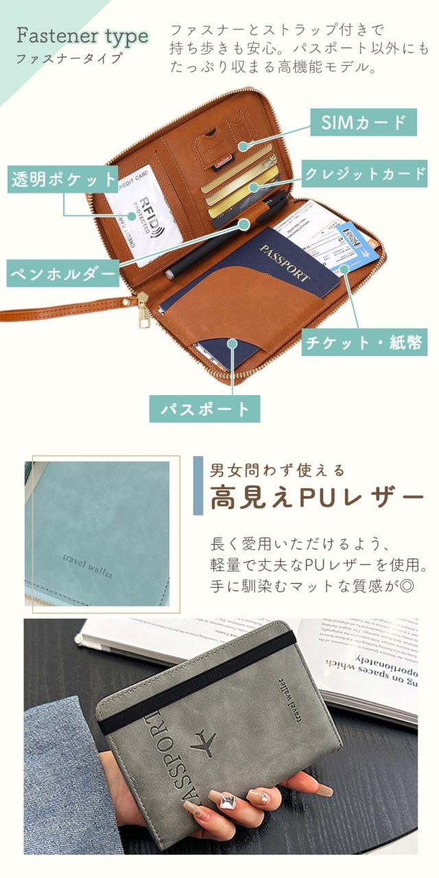 パスポート、搭乗券、チケット、紙幣、クレジットカード、SIMカードまで、旅行に必要な貴重品をひとつにまとめて収納できるパスポートケースです。
