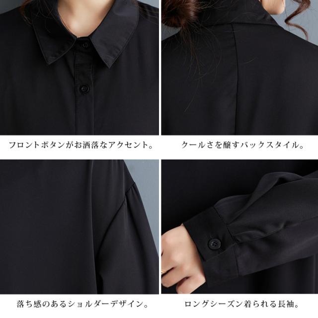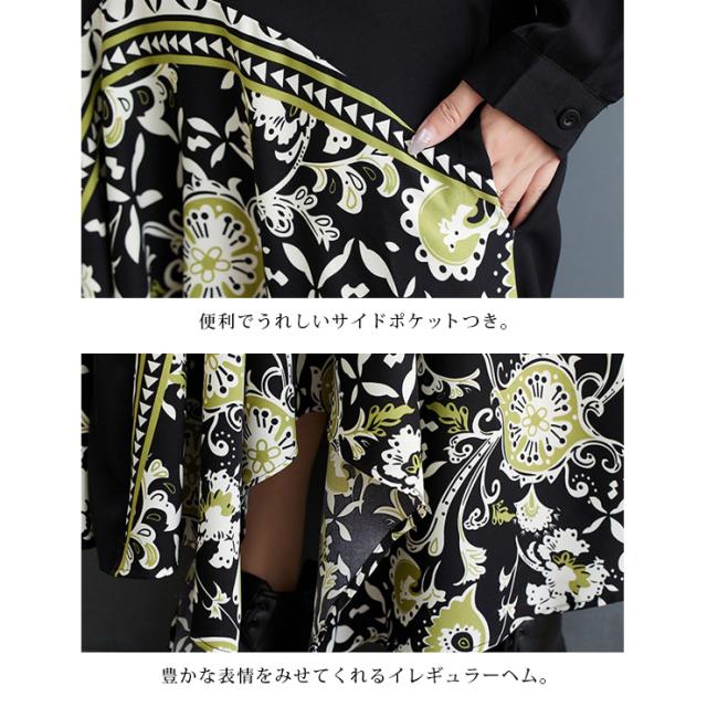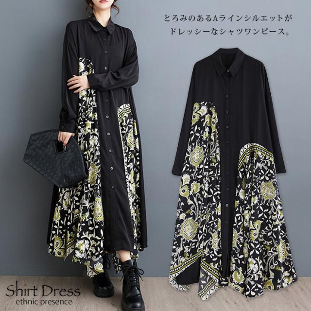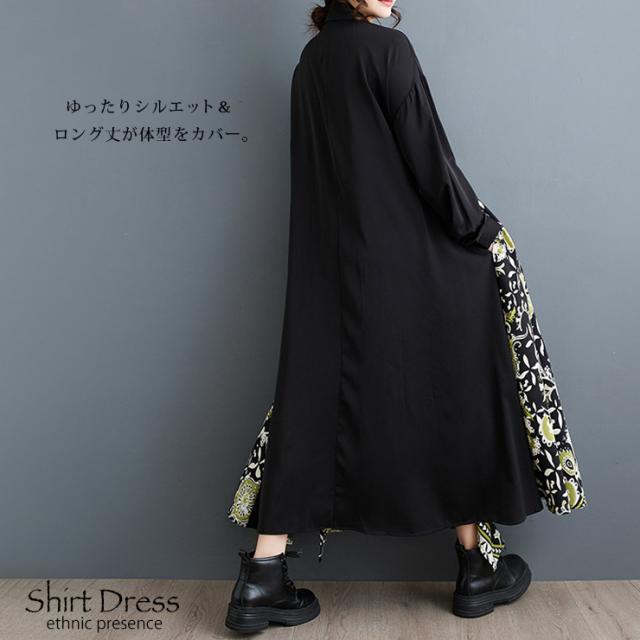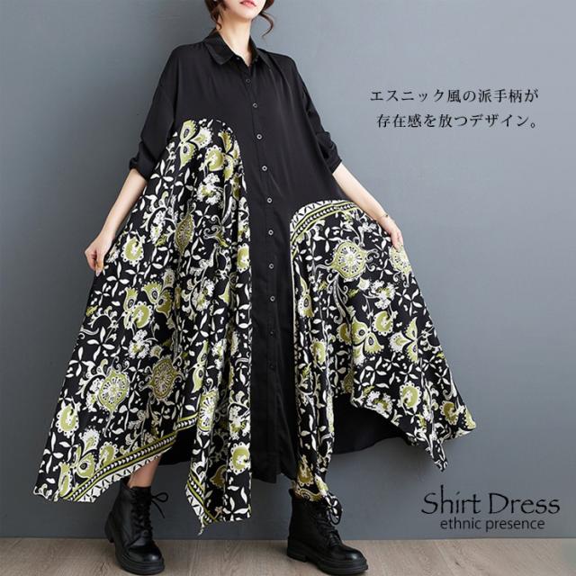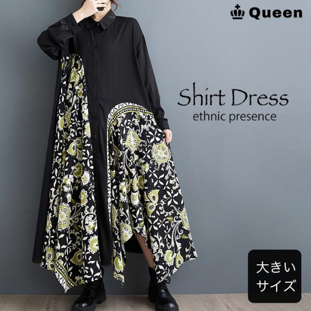 大きいサイズ レディース イレギュラーワンピース エスニック柄 黒 長袖 シャツワンピ 春 秋 (249204)