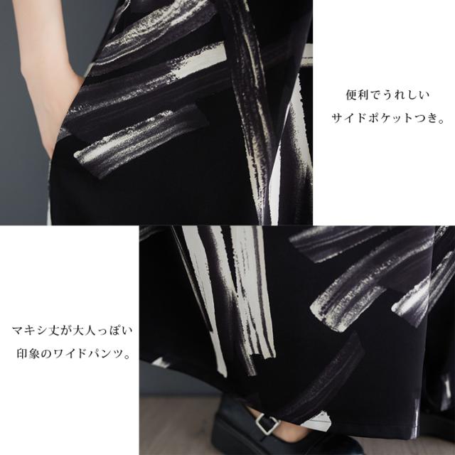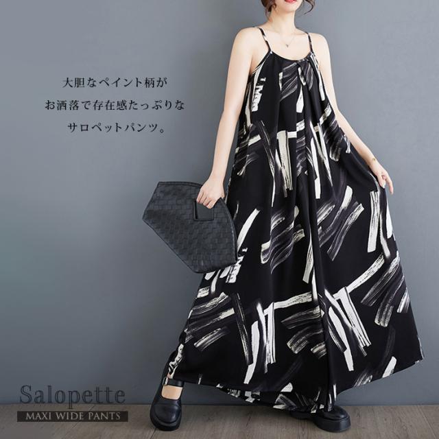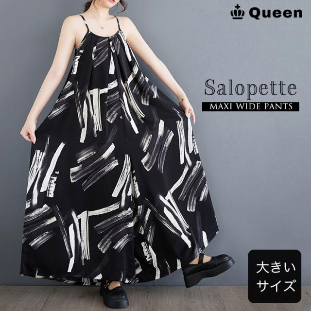 ★☆大きいサイズ レディース サロペットパンツ ワイドパンツ 黒 オールインワン マキシ丈 春夏 秋 LL 3L 4L 5L ペイント柄☆★