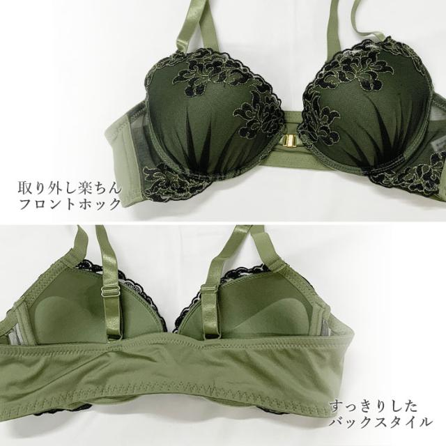 ★☆大きいサイズ フロントホックブラジャー ショーツセット 花柄 ラメ刺繍 レディース 下着 グラマーサイズ グレー カーキ☆★