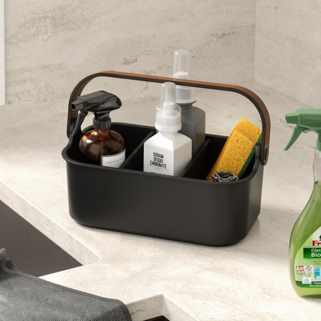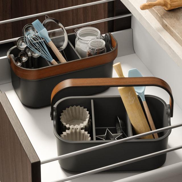 優しい木目のハンドルで洗練されたデザインの収納ボックスです。本体はリサイクルプラスチックと再生可能な木材など、環境に配慮された材料で作られています。深さがあるので、スパイス、キッチンツールなどの細かい物の収納に便利です。