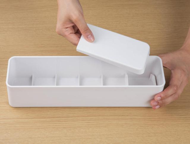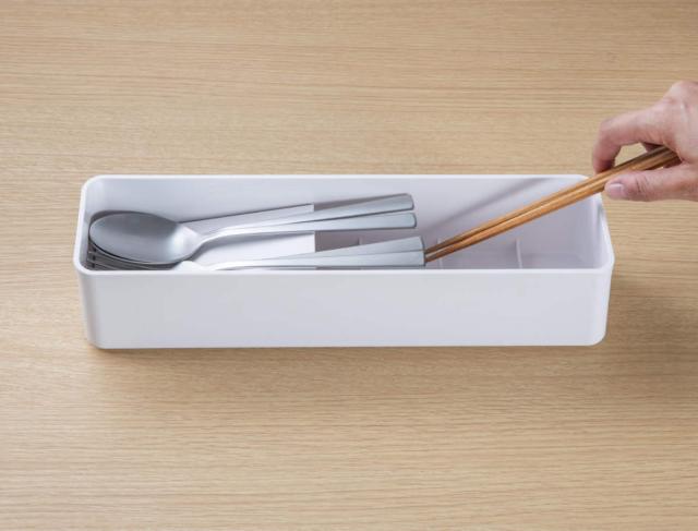 卓上にセットしておけば、すぐにカトラリーが取れるケースです。底にはリブが付いており、カトラリーを取り出しやすい仕様です。フタ付きなので卓上に置いてもほこりが気になりません。