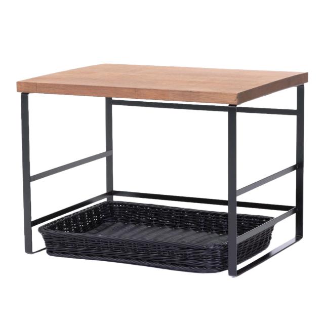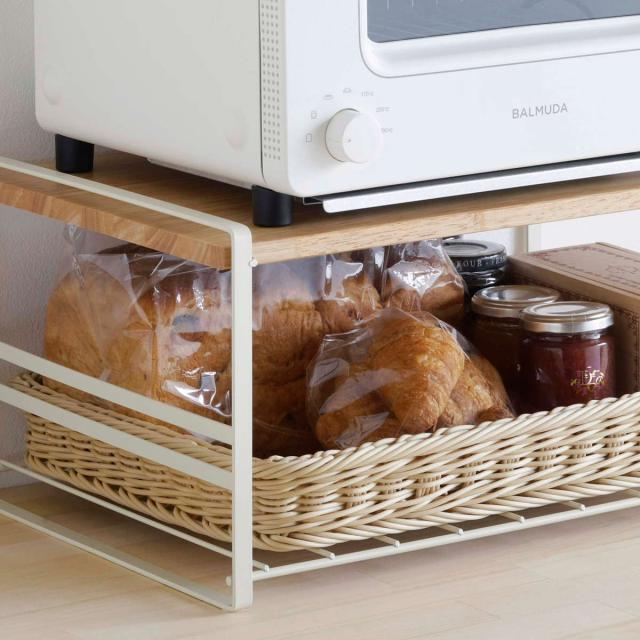 キッチンでトースター下の空間を活用できるラックです。天板が木製なので上からの熱が伝わりにくく、付属のバスケットにパンなどの食品を入れておくことができます。天板下にトースターを置くこともできます。