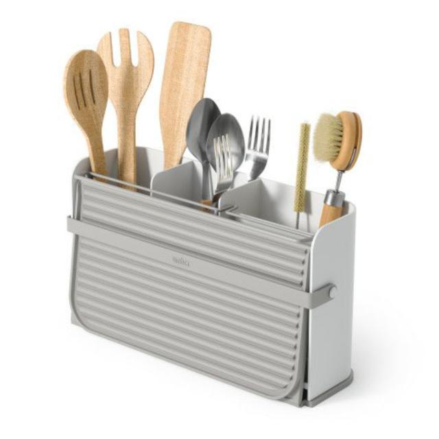 カトラリーやトングなどの調理器具、スポンジやタワシなどの食器洗い用アクセサリーが収納できる3つのスペースがあります。