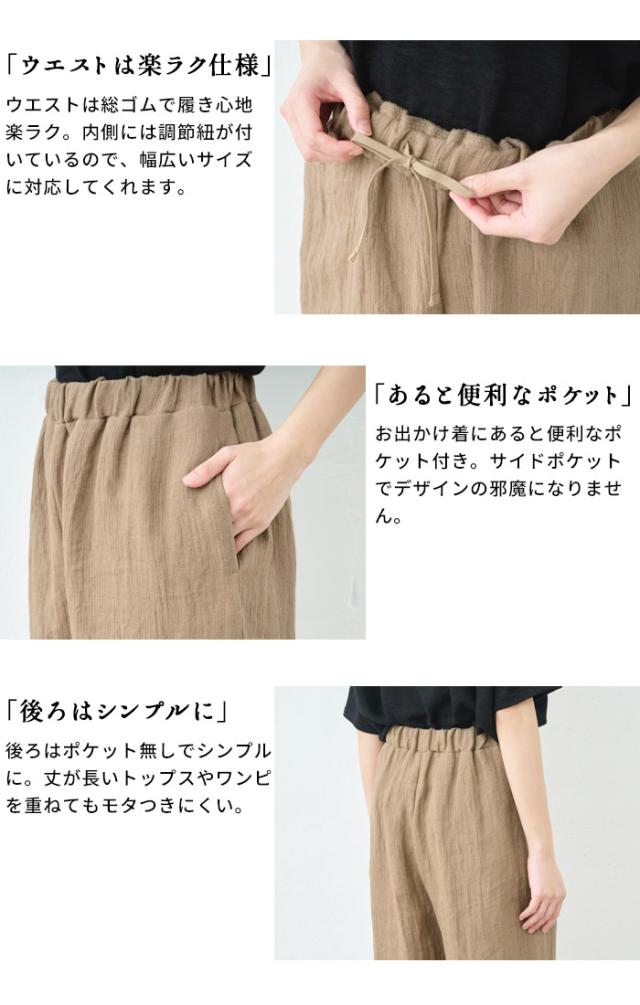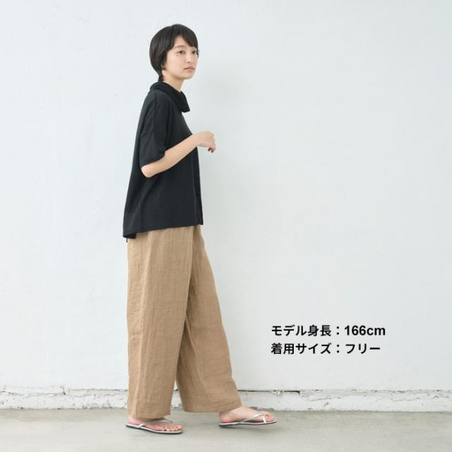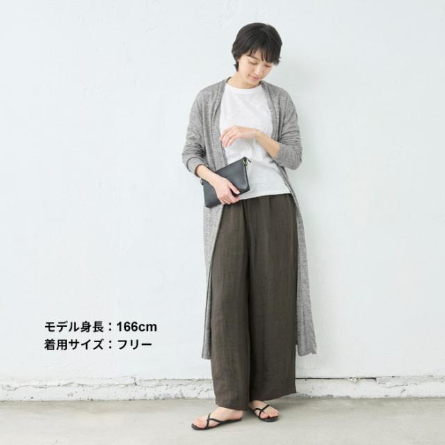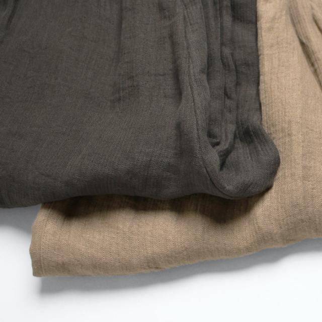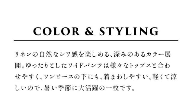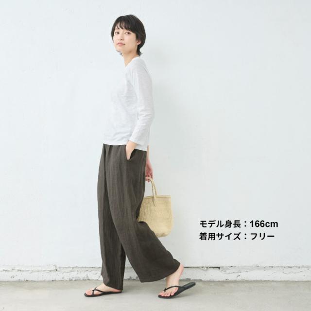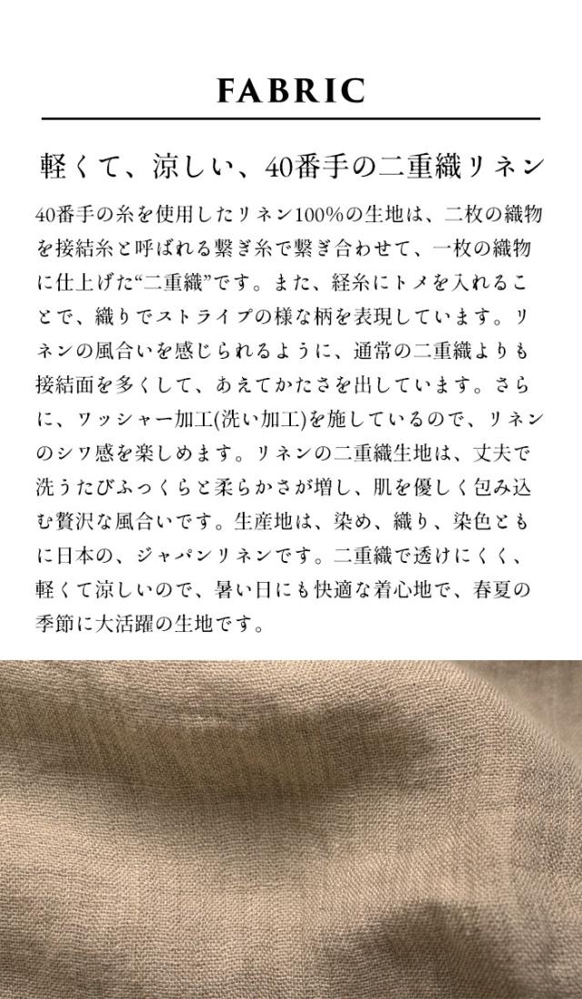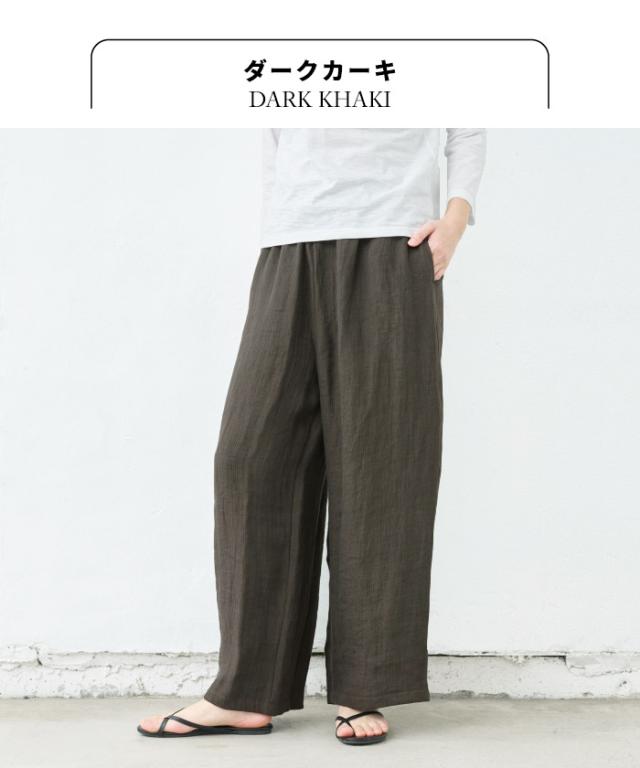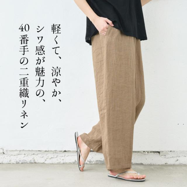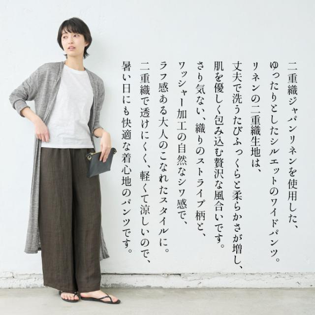 特徴 二重織ジャパンリネンを使用した、ゆったりとしたシルエットのワイドパンツ。リネンの二重織生地は、丈夫で洗うたびふっくらと柔らかさが増し、肌を優しく包み込む贅沢な風合いです。さり気ない、織りのストライプ柄と、ワッシャー加工の自然なシワ感で、ラフ感ある大人のこなれたスタイルに。二重織で透けにくく、軽くて涼しいので、暑い日にも快適な着心地のパンツです。