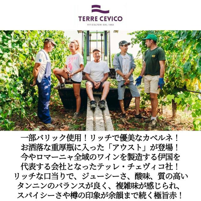 一部バリック使用!リッチで優美なカベルネ! お洒落な重厚瓶に入った「アウスト」が登場! 今やロマーニャ全域のワインを製造する伊国を 代表する会社となったテッレ・チェヴィコ社! リッチな口当りで、ジューシーさ、酸味、質の高い タンニンのバランスが良く、複雑味が感じられ、 スパイシーさや樽の印象が余韻まで続く極旨赤!