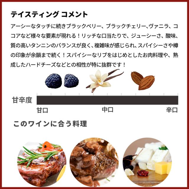 ![]() ■ぶどう品種:カベルネ・ソーヴィニヨン100% ■発酵・熟成:ステンレスタンク発酵、40%をフレンチオーク樽、60%をセメントタンクにて10ヶ月熟成 ■樹齢:不明 ■土壌:粘土質石灰土壌 ■地形:アペニン丘陵 このワインは、濃いガーネットの色調で、アーシーなタッチに続きブラックベリー、ブラックチェリー、ヴァニラ、ココアなど様々な要素が現れる。 リッチな口当たりで、ジューシーさ、酸味、質の高いタンニンのバランスが良く、複雑味が感じられ、スパイシーさや樽の印象が余韻まで続く。 一部バリック(オークの小樽)を使用したリッチな仕上がりながらも、エレガントさや優美さを持ち合わせている。 スパイシーなリブをはじめとしたお肉料理や、熟成したハードチーズなどとの相性が特に抜群だ。 |