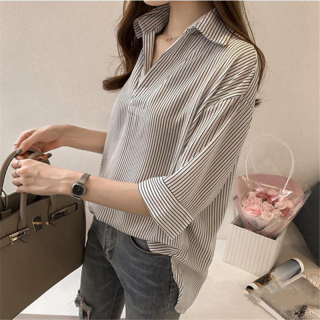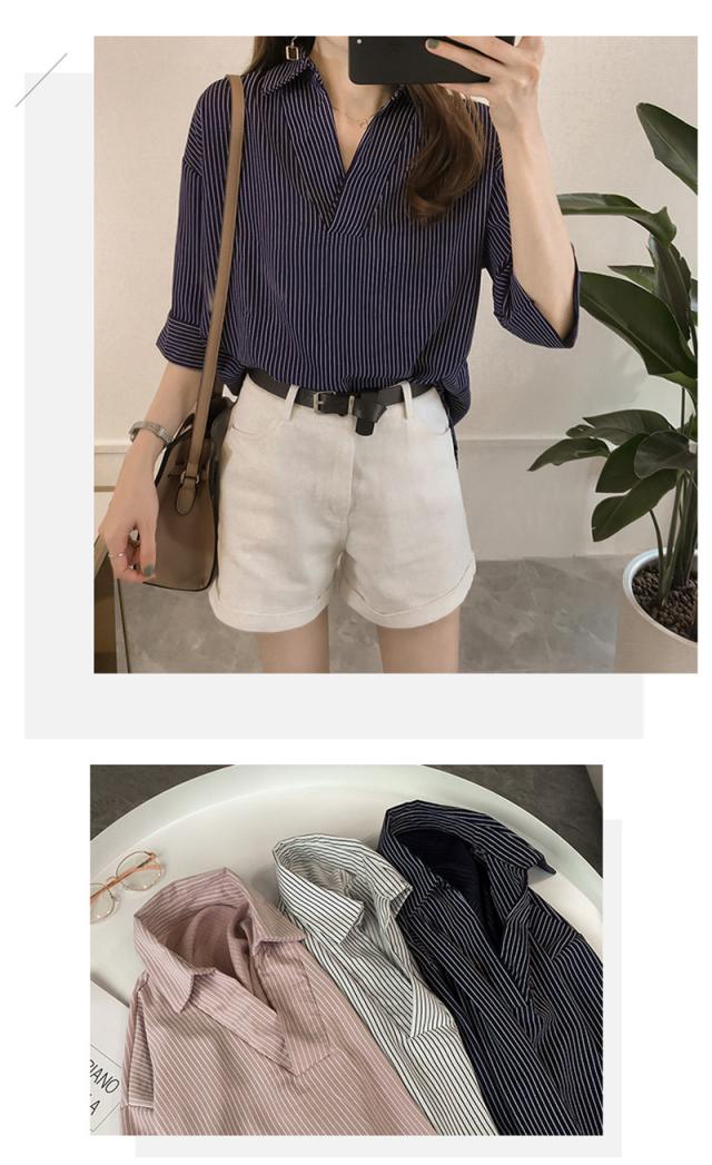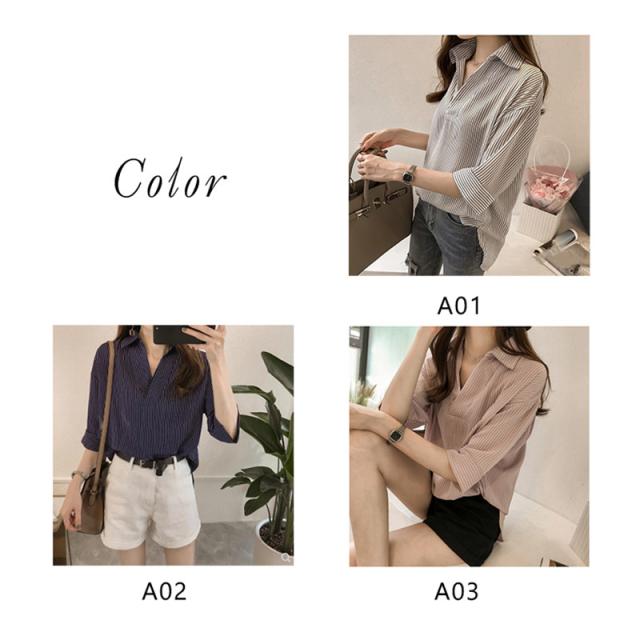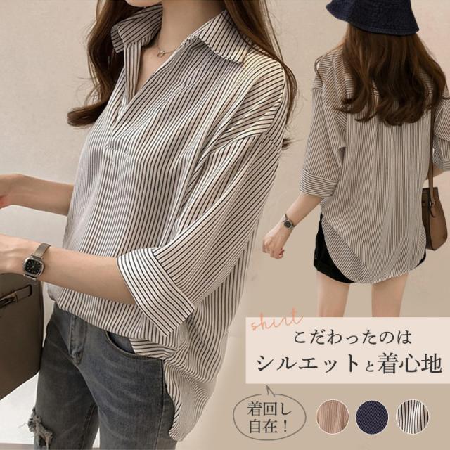 シャツ ブラウス レディース シフォン 五分袖 トップス 春 夏 薄手 ストライプ柄 Vネック ゆったり 体型カバー 着痩せ きれ