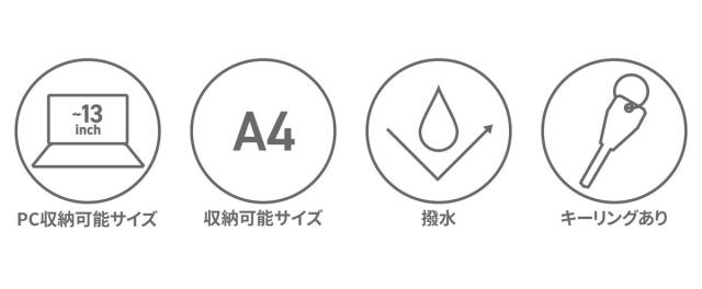 | 仕様 | <外側> ジップポケット(L)×1 └ 内蔵 ポケット(M)×2 キーホルダー(取り外し可能)×1 <内側> PC収納×1 メッシュジップポケット(L)×1 ポケット(M)×2 |