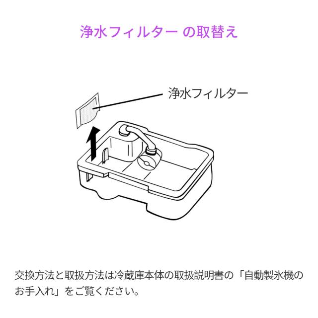 ● ミツビシ冷蔵庫 自動製氷用 浄水フィルター「互換品」対応形名: M20KY6526 (当商品はM20CM4526とも同等品になります。) ● 浄水フィルターは定期的にお取替えください(使用期間の目安: 1日2L水道水の使用で約1〜2年)。氷にニオイがついたり、氷が小さかったりとデキが悪くなったと思ったら交換時期です。 ● 本品は消耗品です、水質の違いなどにより、交換の時期が早まることがあります。次のようなときは交換してください。 ・水以外の物を入れるなどして目詰まりしたとき ・破損したとき ・カビが発生したとき ● 交換方法と取扱方法は冷蔵庫本体の取扱説明書の「自動製氷機のお手入れ」をご覧ください。 |