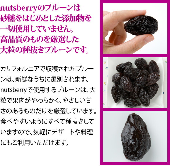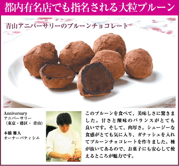 | 注意 | 寒い時期の到着後及び冷蔵庫で保管する場合は、プルーンが固く感じられる場合がございます。常温に戻すと柔らかくなりますのでお試しください。 | |||||||