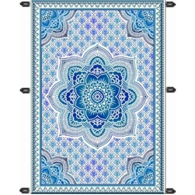鮮やかな色彩のマンダラが目を惹くマルチクロス。マンダラの周りに細かな花模様がグラデーションで浮かび上がるような柄は、インドの寺院によく見られる建築モチーフや水面に浮かぶロータスをイメージ。裏に6つのループが付き、ベッドカバーやタープクロスなどマルチに使えます。